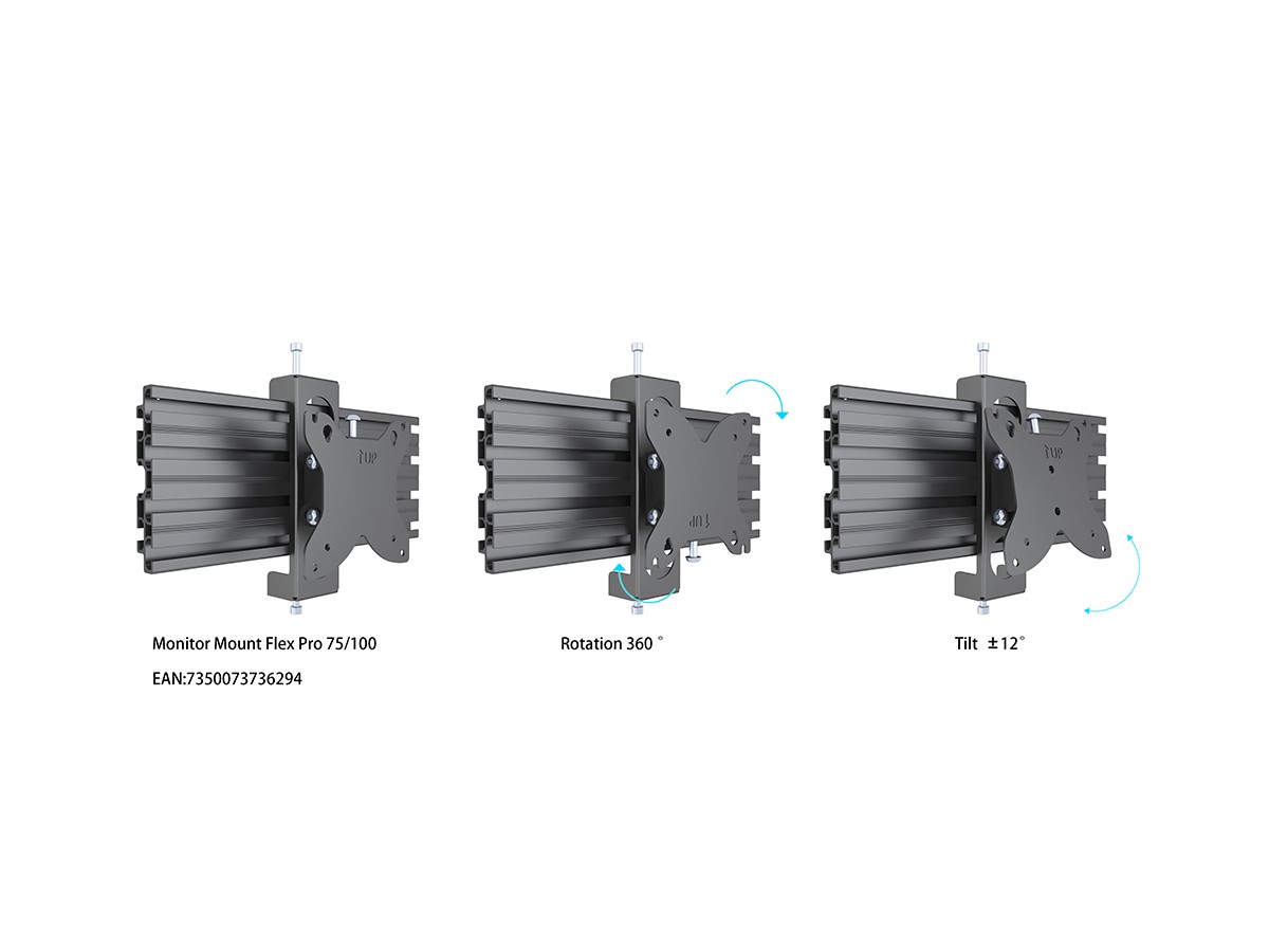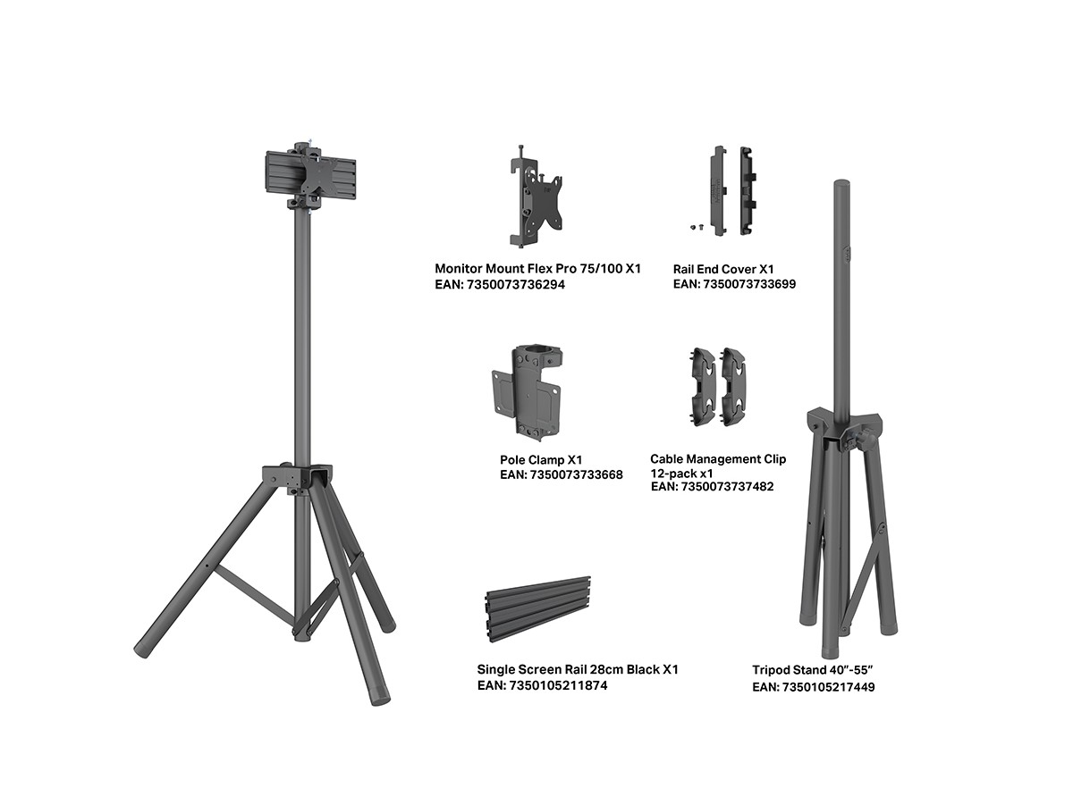 A Signage Campaign up and running in 15 minutes - This model the M Pro Series - Tripod Monitor Stand VESA 75/100 is no exception. The product provides the versatility and flexibility demanded by installers. Based upon the Pro Series strong and ultra-flexible aluminum rail it is completely modular and has built in cable management throughout the entire solution to quicken installation and creating an esthetic result worth the public eye.